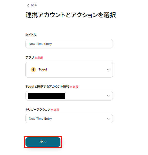 2.表示された画面で必須項目を入力します。トリガーアクションはそのままにして、「次へ」をクリックしましょう。