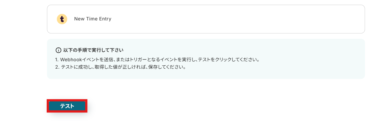 次はタスクを取得するためのテストを行うため、Togglにテスト用のタスクを作成した後に「テスト」をクリックし、問題がなければ「保存する」をクリックしましょう。