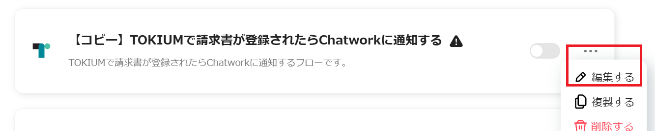 登録が完了したら、「TOKIUMで請求書が登録されたらChatworkに通知する」フローボットを作成していきます。