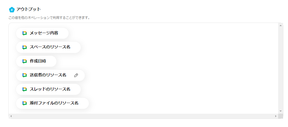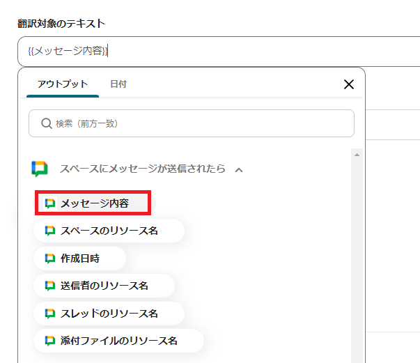 「スペースにメッセージが送信されたら」のアウトプットから該当の項目を選択してください。