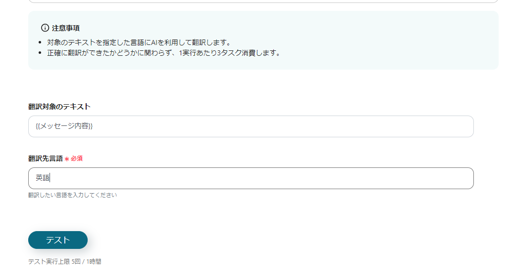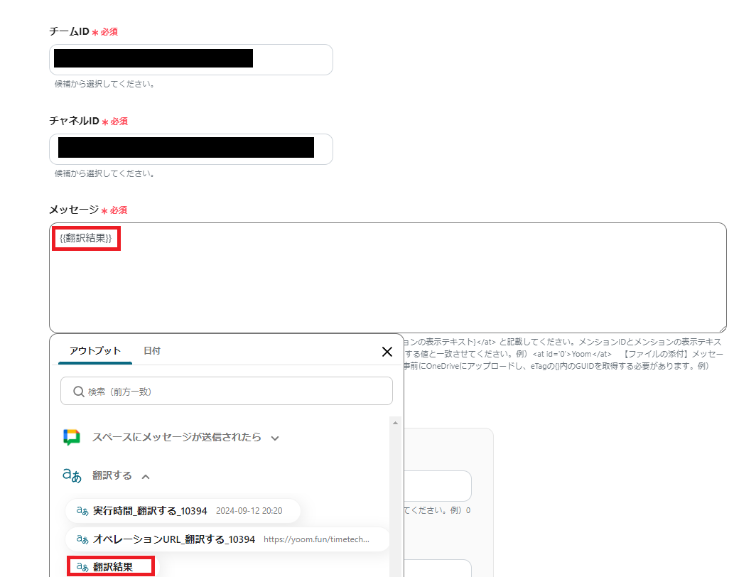 「メッセージ」の項目には翻訳結果のアウトプットを設定しましょう。