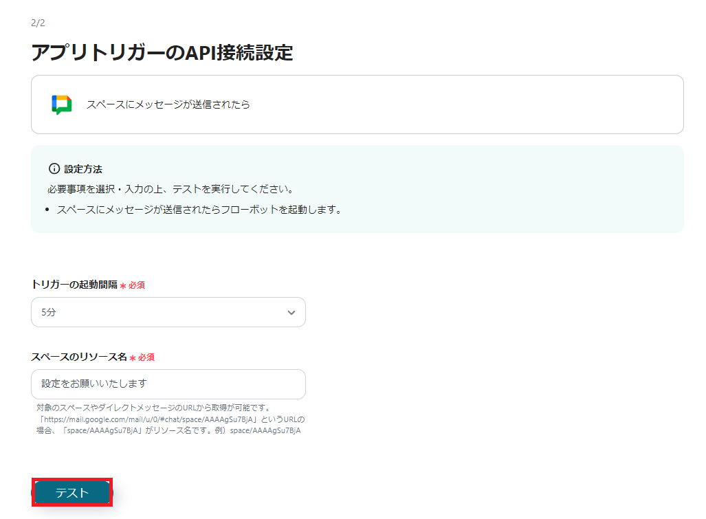 以下のような画面に遷移するので、「トリガーの起動間隔」「スペースのリソース名」を設定してテストボタンを押してください。