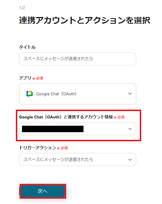 まずは「スペースにメッセージが送信されたら」を選択して、設定の確認をしていきます。