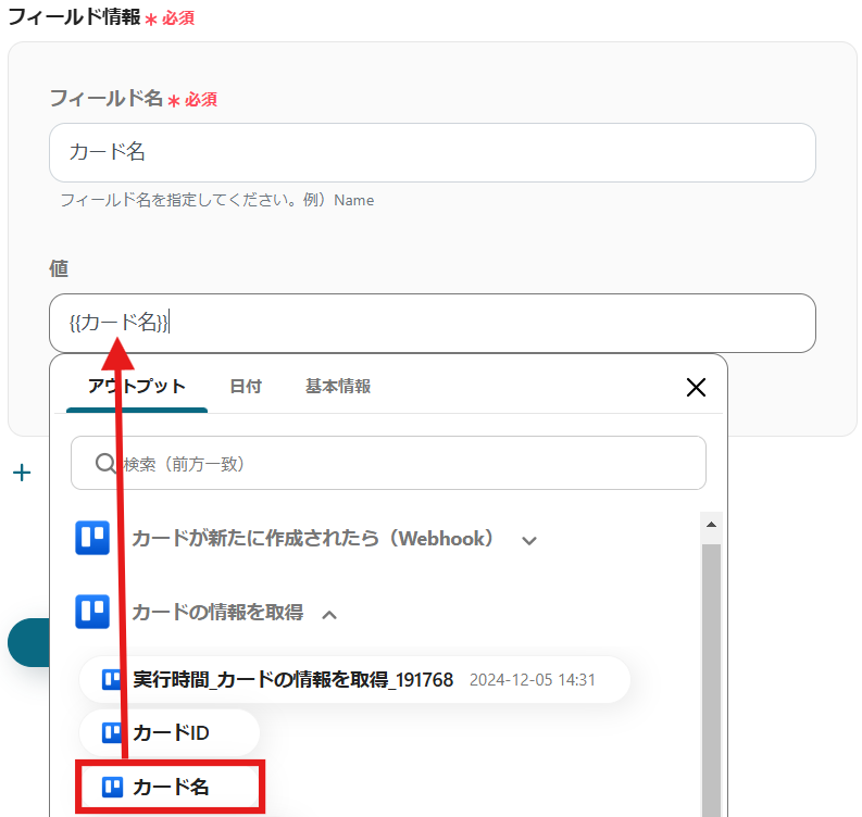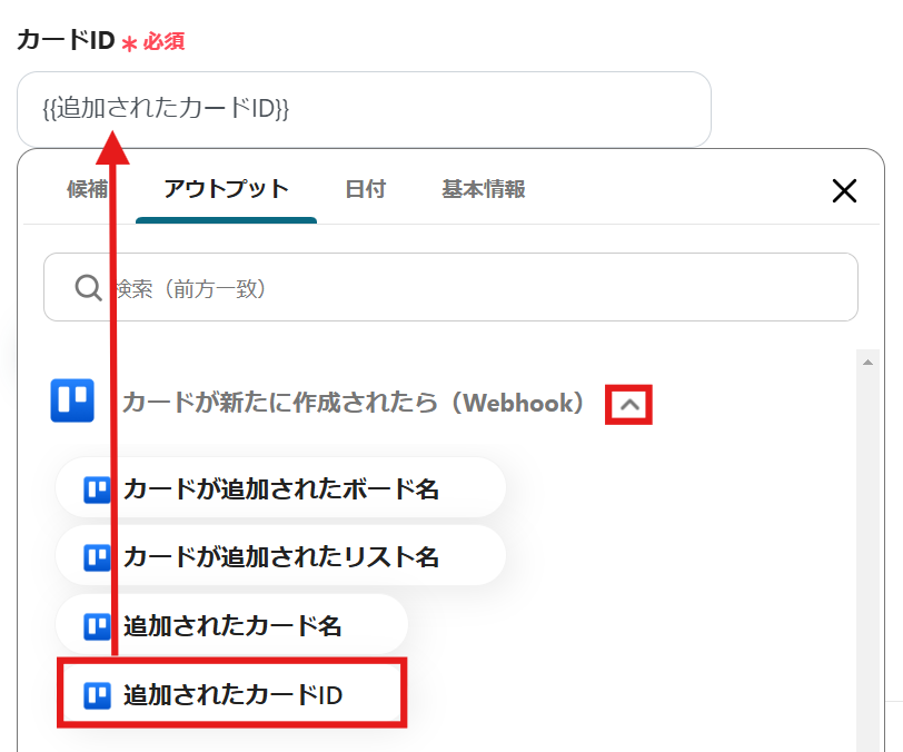 赤枠内の矢印をクリックして、アウトプットを表示し、「追加されたカードID」を選択しましょう。