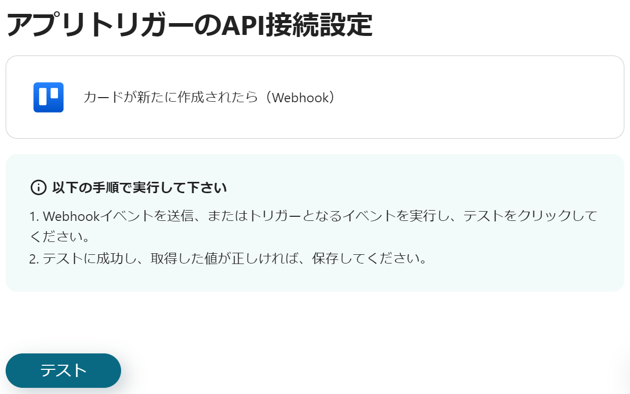 以下の画面が表示されたら、Webhookイベントを送信するか、トリガーとなるイベントを実行して「テスト」→「テスト成功」→「保存」をクリックしましょう。