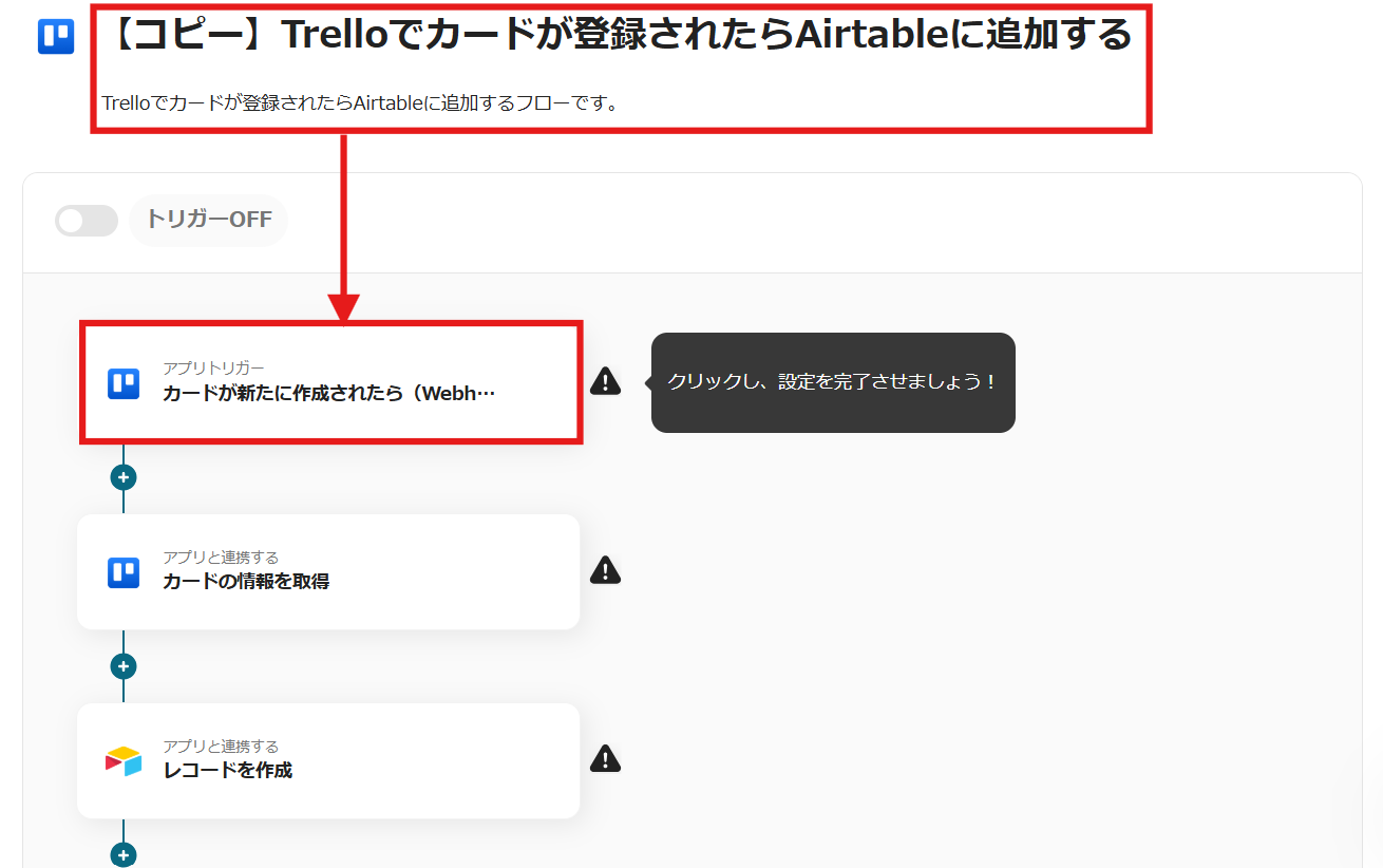 今回は「Trelloでカードが登録されたらAirtableに追加する」という以下のテンプレートの設定方法をご紹介します。