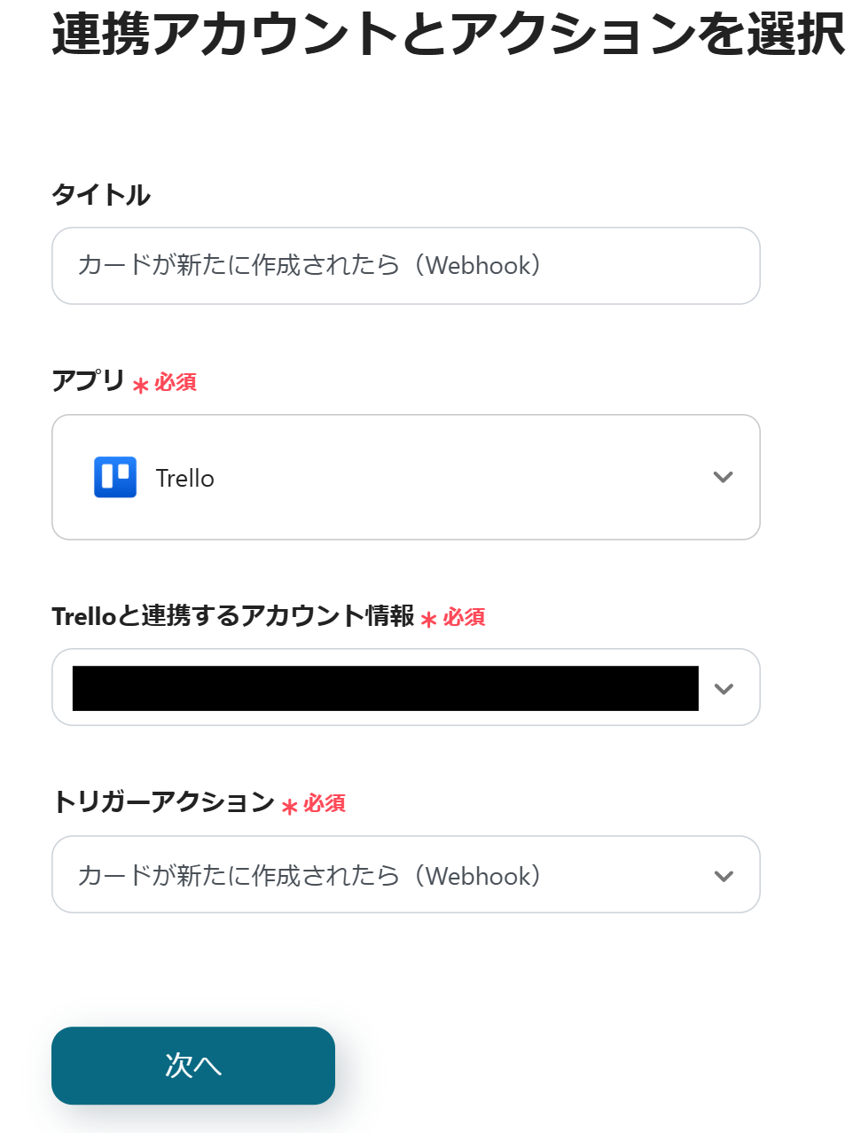 最初にTrelloの設定を行うため、「カードが新たに作成されたら(Webhook)」をクリックします。