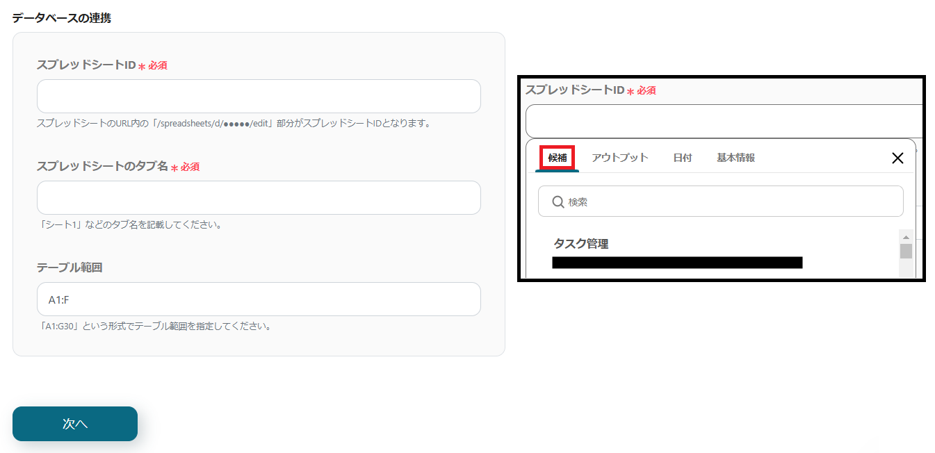 ※スプレッドシートIDとスプレッドシートのタブ名は、枠をクリックして表示される「候補」から設定できます。