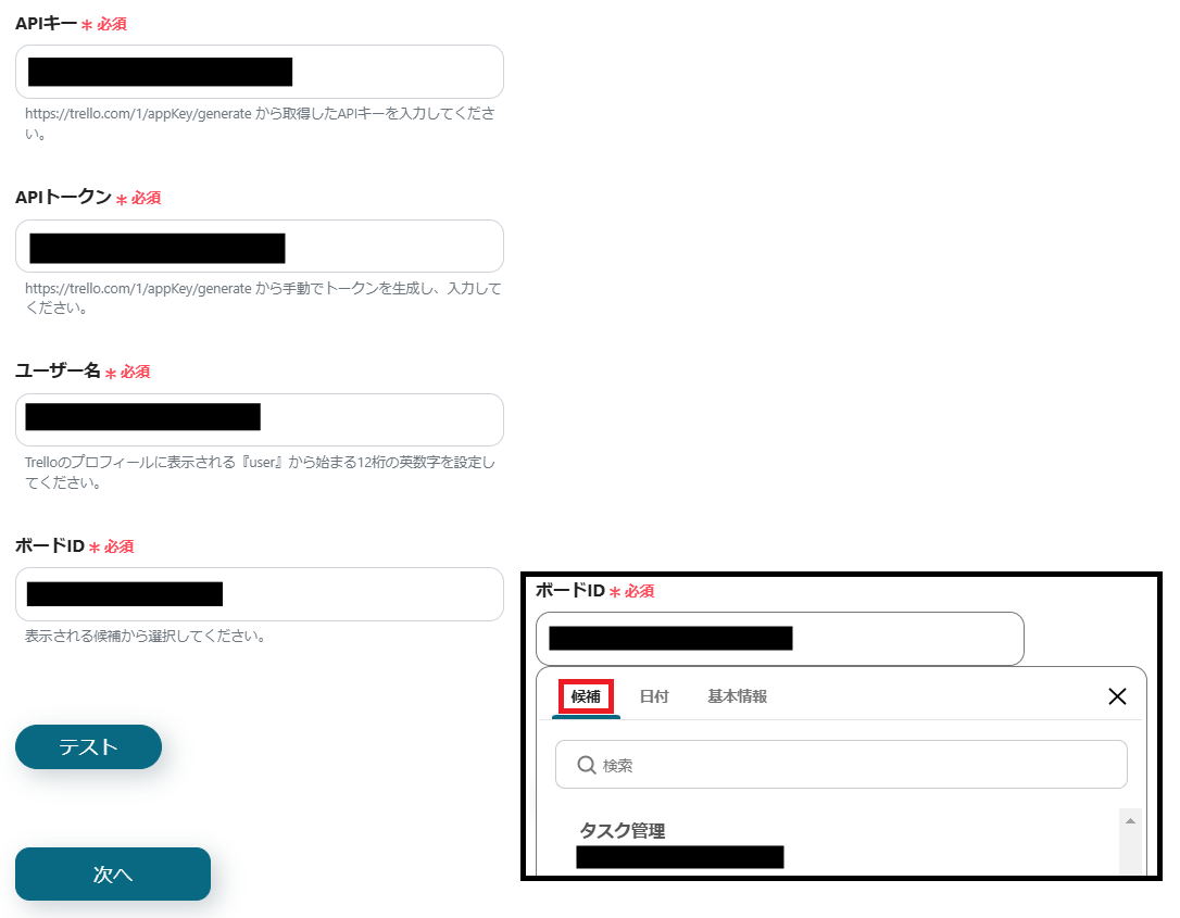4.APIキー、APIトークン、ユーザー名、ボードIDを設定し、テストを行います。