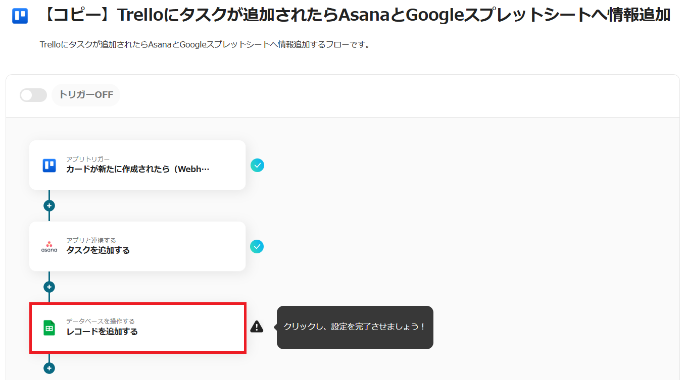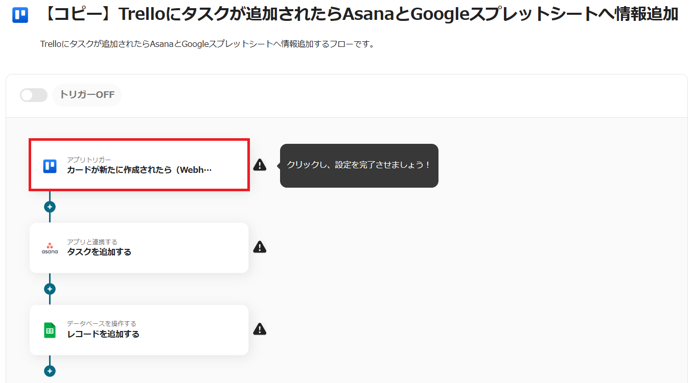 このフローではTrelloでタスクが追加されるとトリガーが起動します。