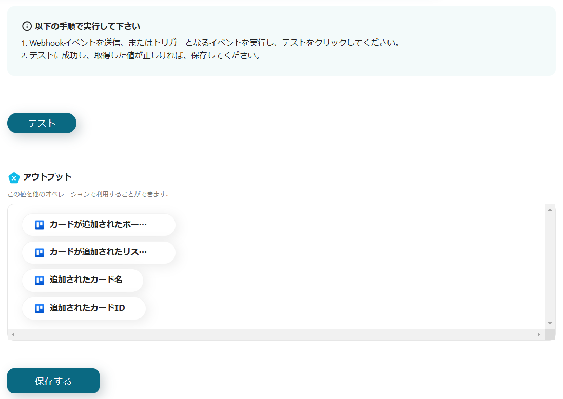 ※Trelloの情報を反映する項目は、枠をクリックして表示されるアウトプットの「カードが新たに作成されたら(Webhook)」から設定します。(値は二重括弧で表示されます)