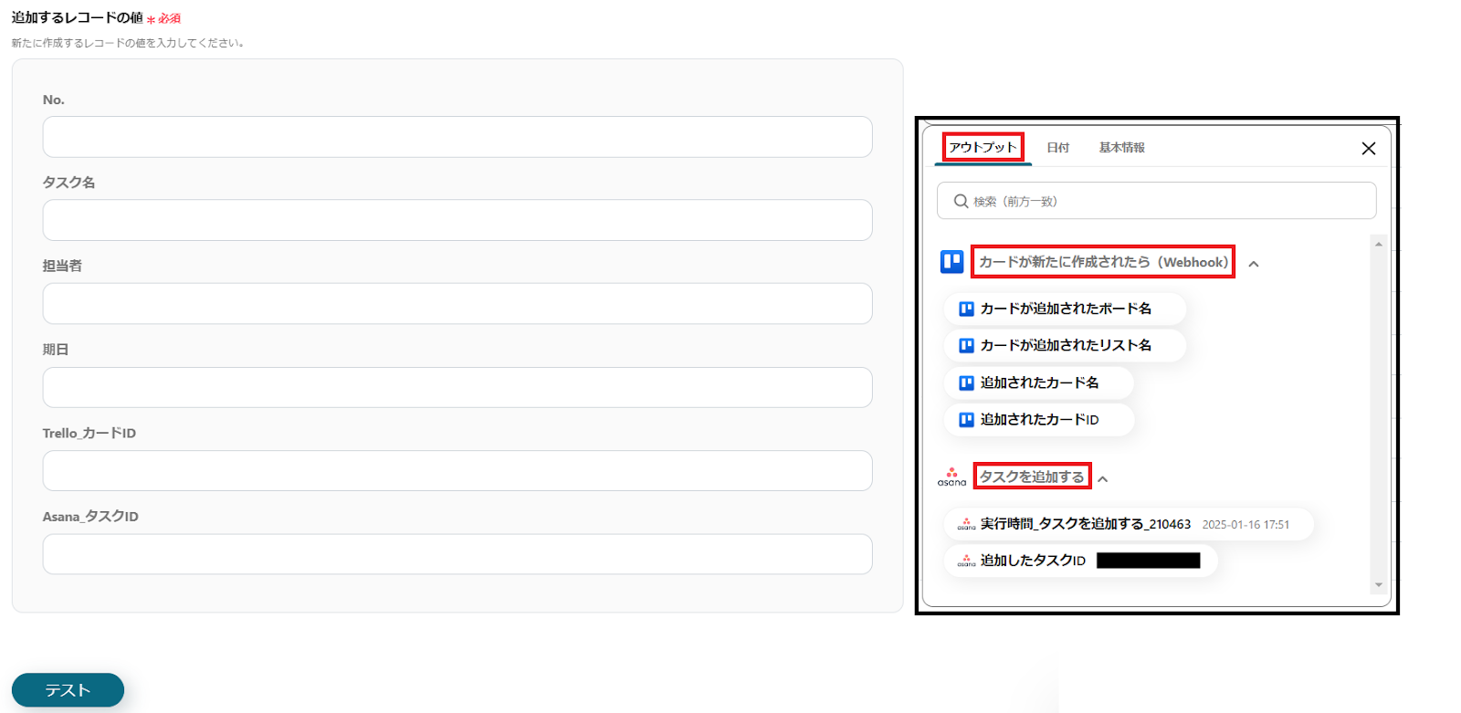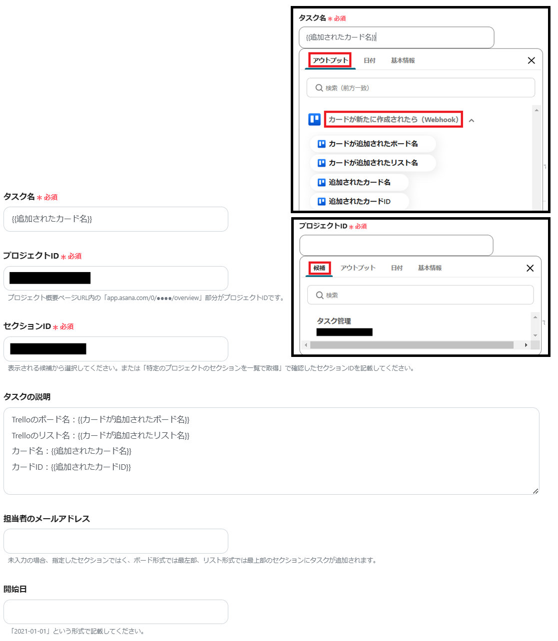 ※TrelloまたはAsanaの情報を反映する項目は、枠をクリックして表示されるアウトプットの「カードが新たに作成されたら(Webhook)」や「タスクを追加する」から設定します。(値は二重括弧で表示されます)