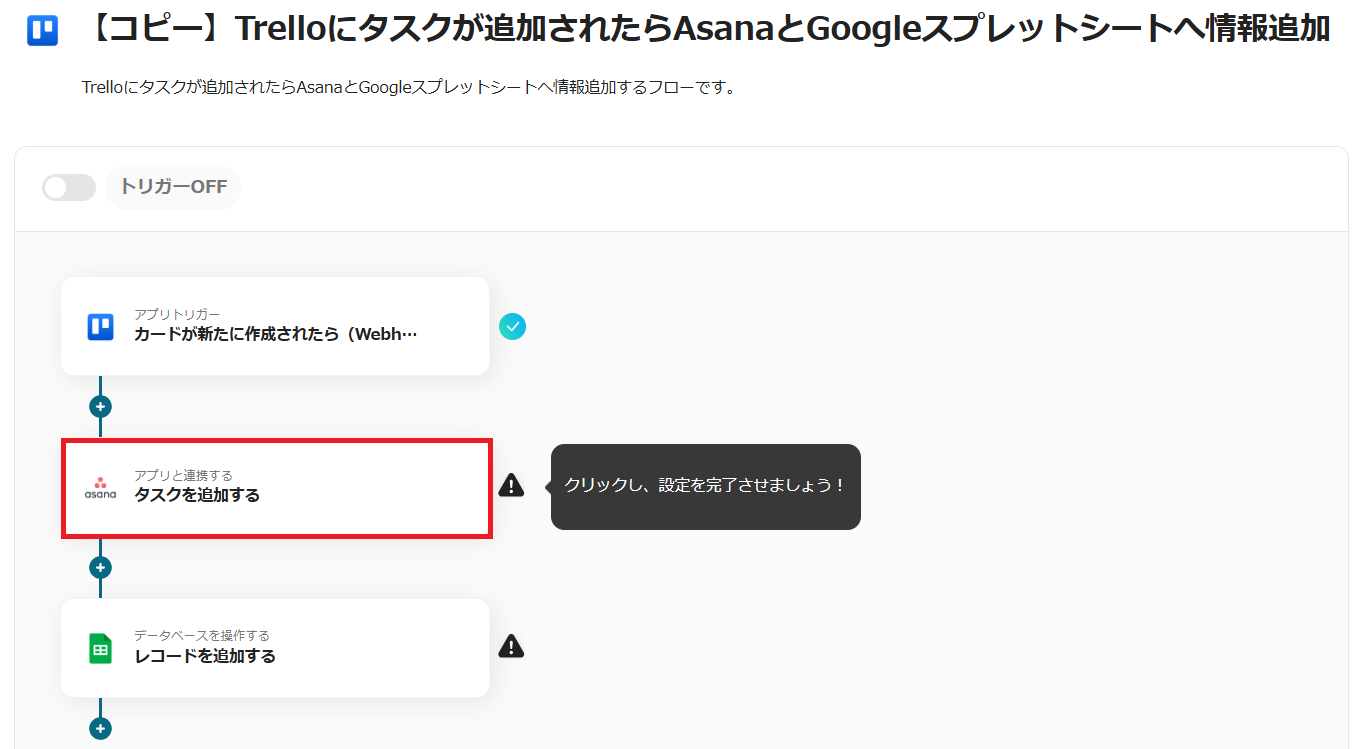 6.トリガーをONにすると、Trelloにタスクが追加されるたび、AsanaとGoogle スプレッドシートにもタスクが自動追加されます。