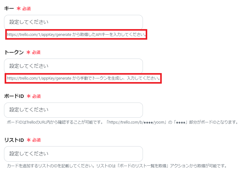 キーとトークン、ボードIDは画像赤枠の部分のとおりなのでコピペでOK!