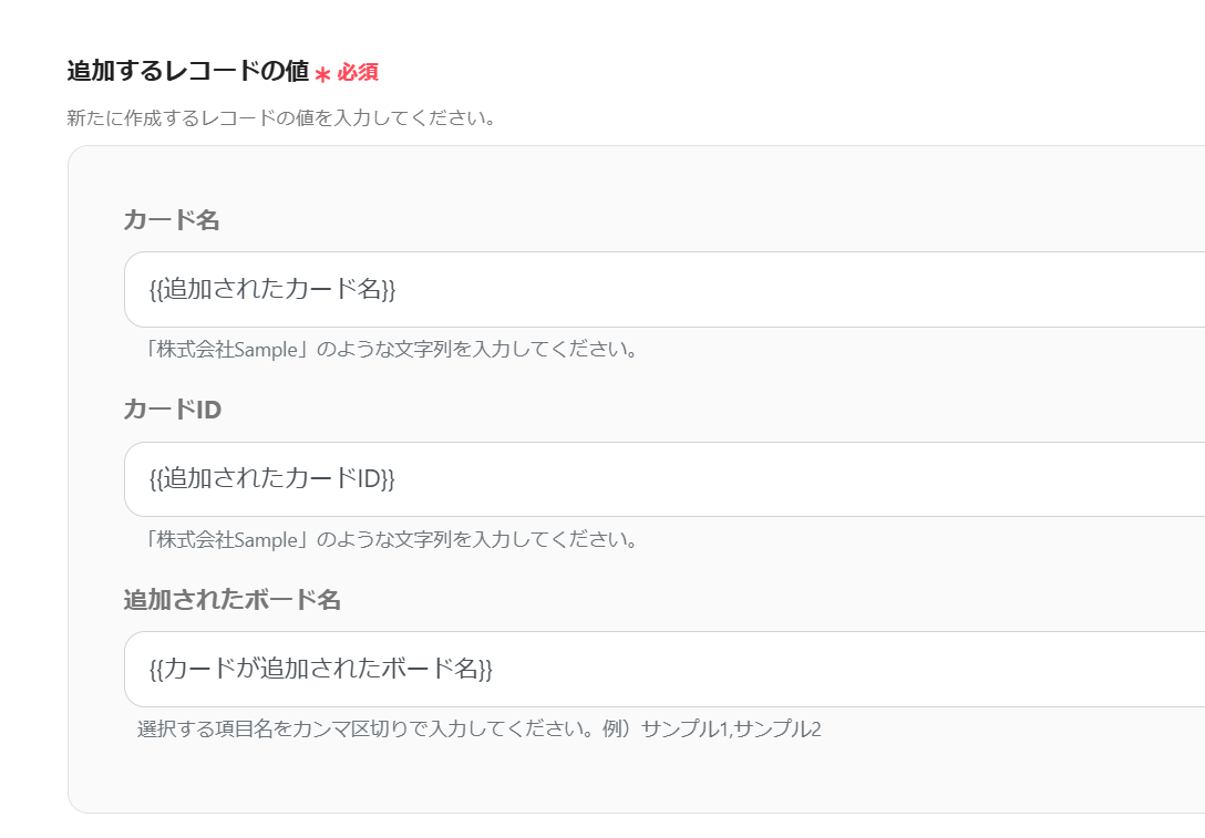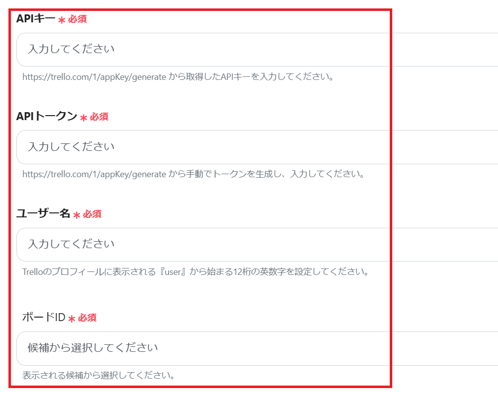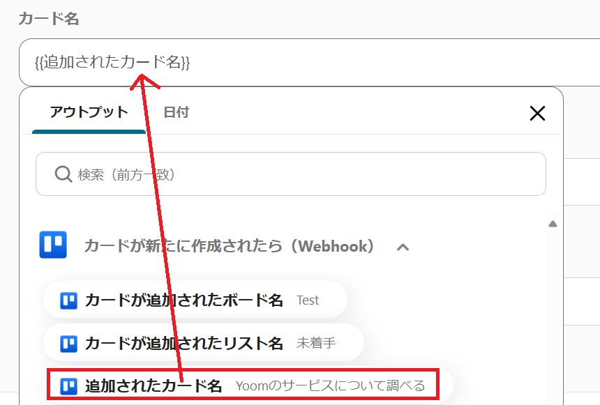 以下の画面は何も入力せずにテストし、アウトプットにTrelloのカード情報が反映していたら保存します。