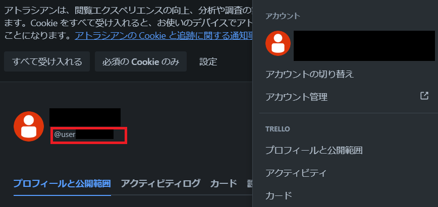 ユーザー名:Trelloの「プロフィールと公開範囲画面」から確認してください