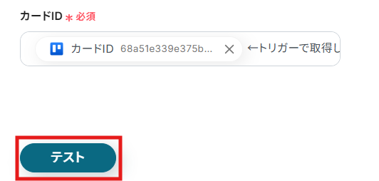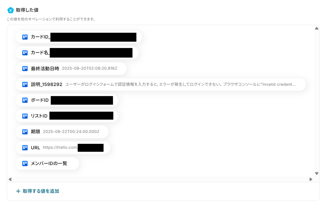 - その後、オペレーションでTrelloの「カードの情報を取得」アクションを設定し、更新されたカードの詳細情報を取得します。