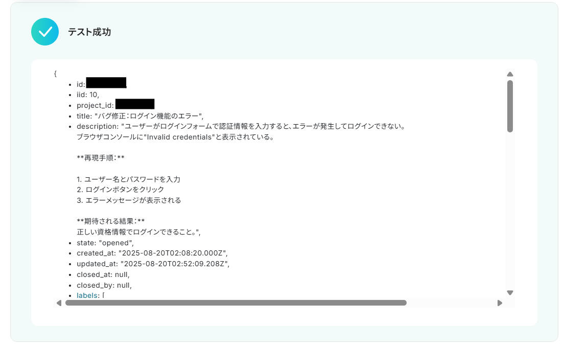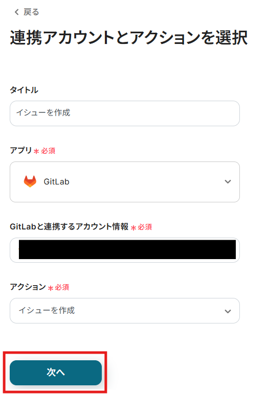 - 最後に、オペレーションでGitLabの「イシューを作成」アクションを設定し、取得した情報をもとに新しいイシューを作成します。