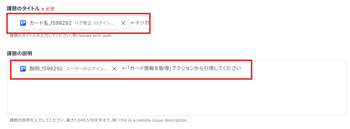 - 作成するイシューのタイトルや本文に、Trelloから取得したカード名や説明といったどの情報を反映させるか、自由にカスタマイズしてください。