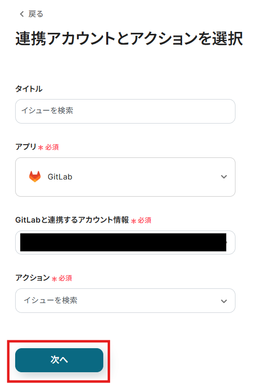 - 続いて、オペレーションでGitLabの「イシューを検索」アクションを設定し、重複するイシューがないかを確認します