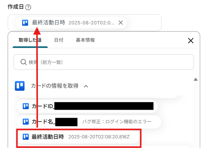- 続けて、オペレーションでTrelloの「カードの情報を取得」アクションを設定し、イシュー作成に必要な情報を取得します