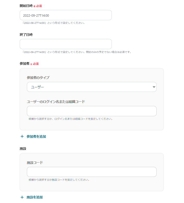 その他、開始日時とユーザーを入力し必要であればメモや終了日時などの欄も入力しておきましょう。
