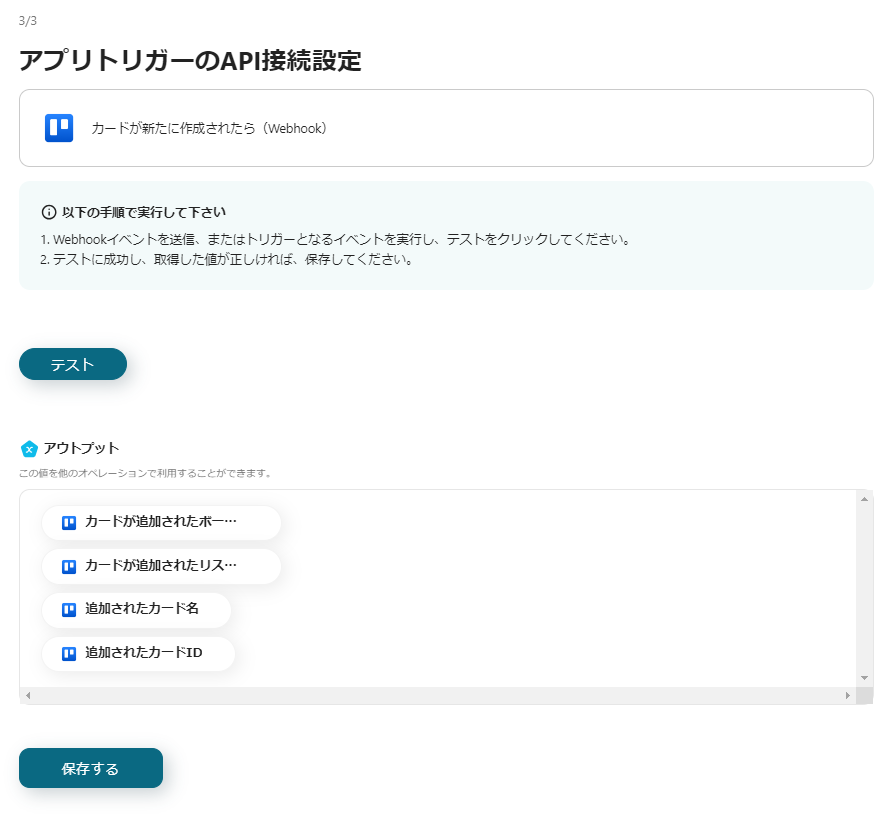 テストが成功すると、上の画像のようにTrelloの項目がアウトプットとして反映されます。