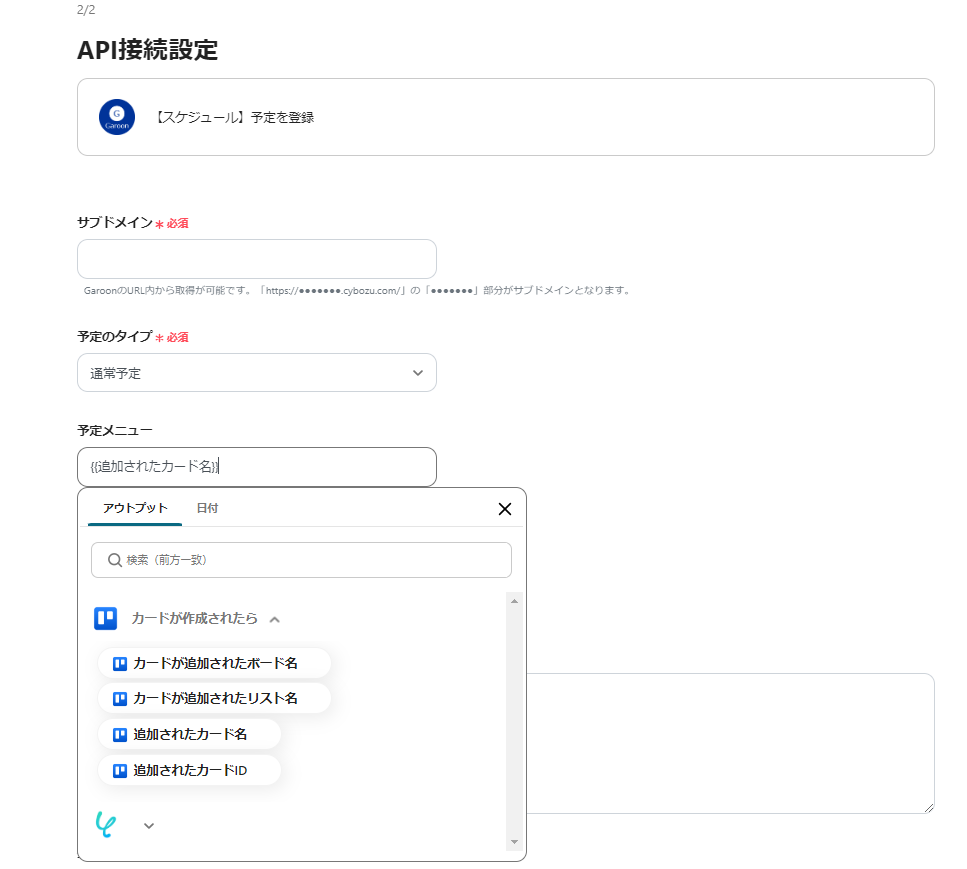 予定メニューは、Trelloの設定で反映されたアウトプットから選択します。