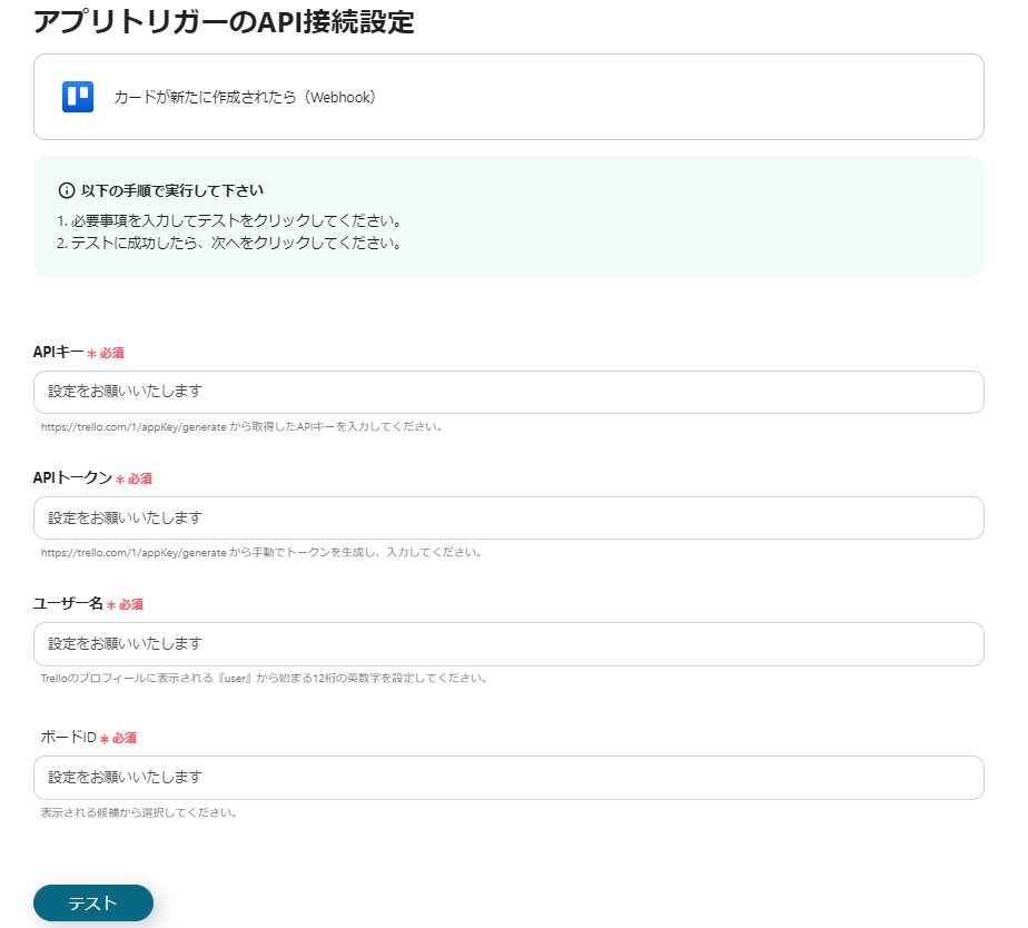 次の画面では、あらかじめTrelloでタスクを作成してテストを実行してください。