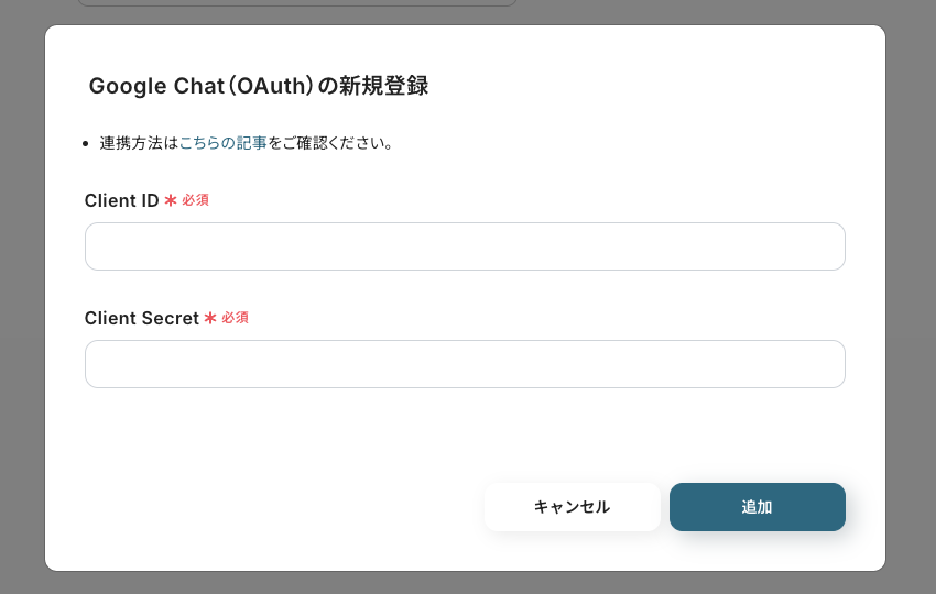 取得後、「Client ID」と「Client Secret」の情報を入力し、[追加]をクリックします。