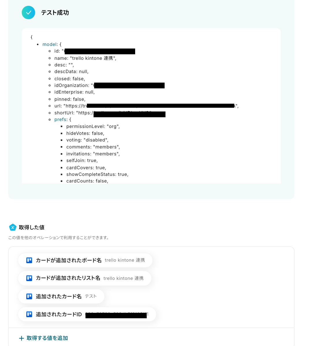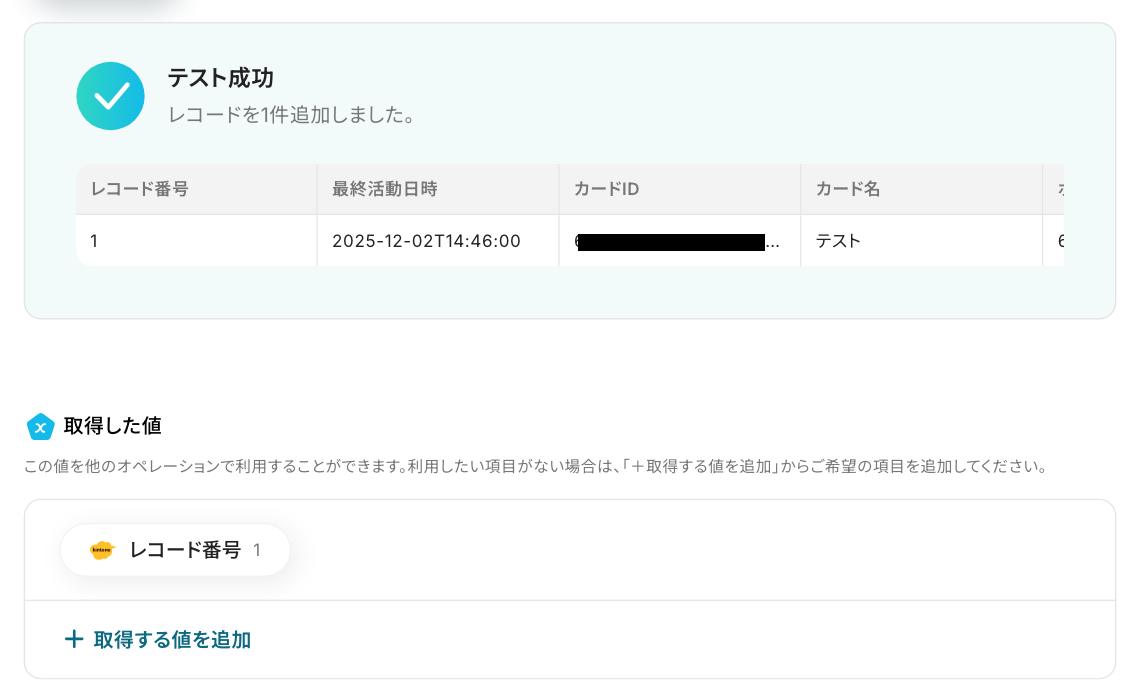 テスト成功となり、下記画像のようにTrelloで作成した内容が取得した値として表示されたのを確認したら、「完了」を押します。