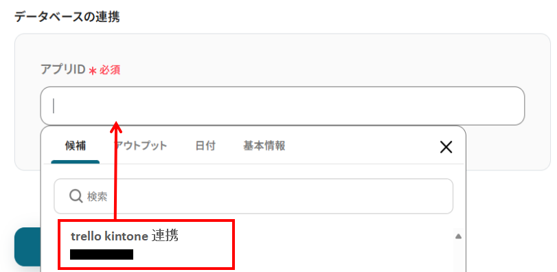 入力欄をクリックすると下記画像のように候補が表示されますので、先ほど作成したkintoneアプリを選択します。
