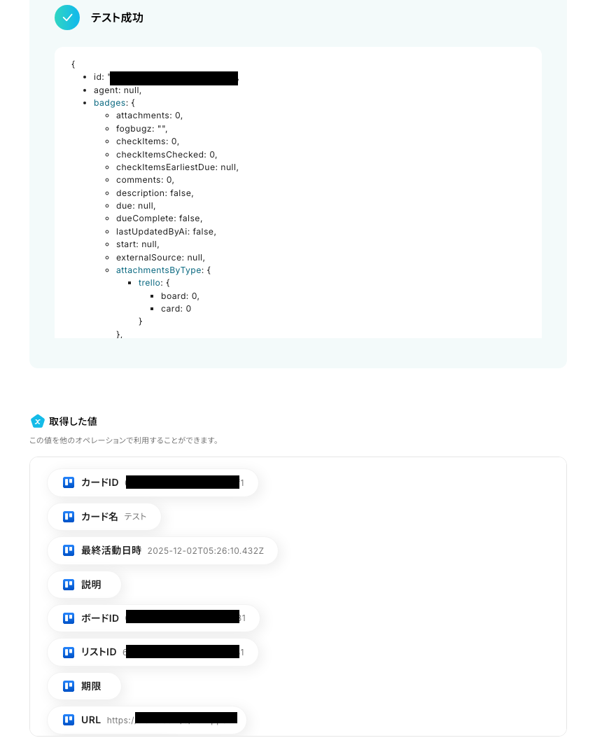 テストが成功すると下記画像のようにTrelloの内容が取得した値として表示されます。