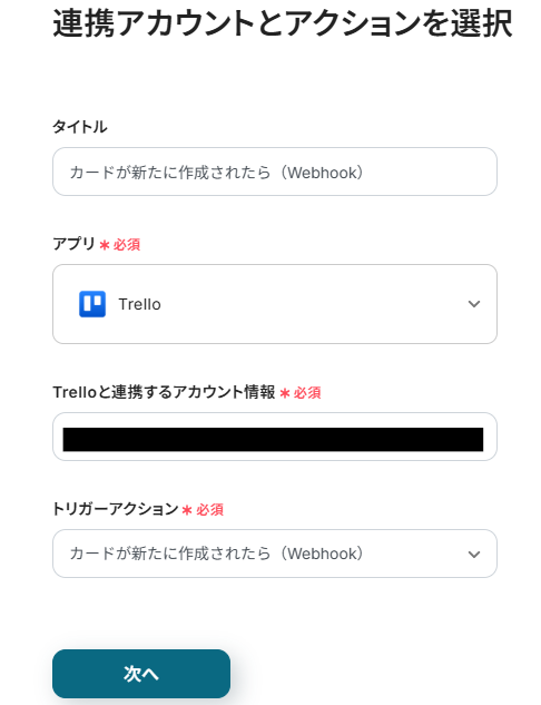 - 「トリガーアクション」→カードが新たに作成されたら(Webhook)