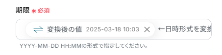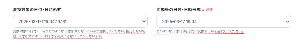 3.「変換対象の日付・日時形式」と「変換後の日付・日時形式」を入力欄下の補足内容を確認して入力します。