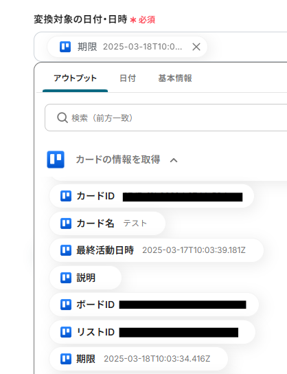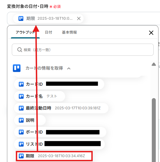 2.「変換対象の日付・日時」をアウトプットから選択します。