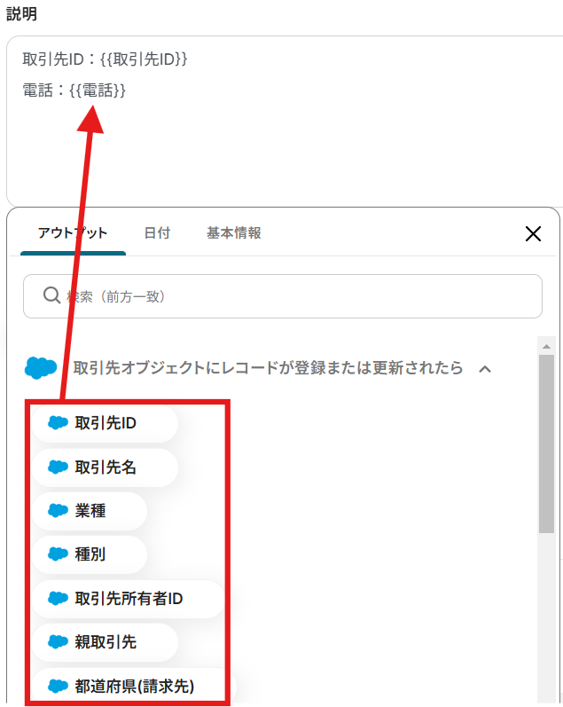 説明欄にSalesforceの取引先情報を追加することで、更新された取引情報を追加することもできます。