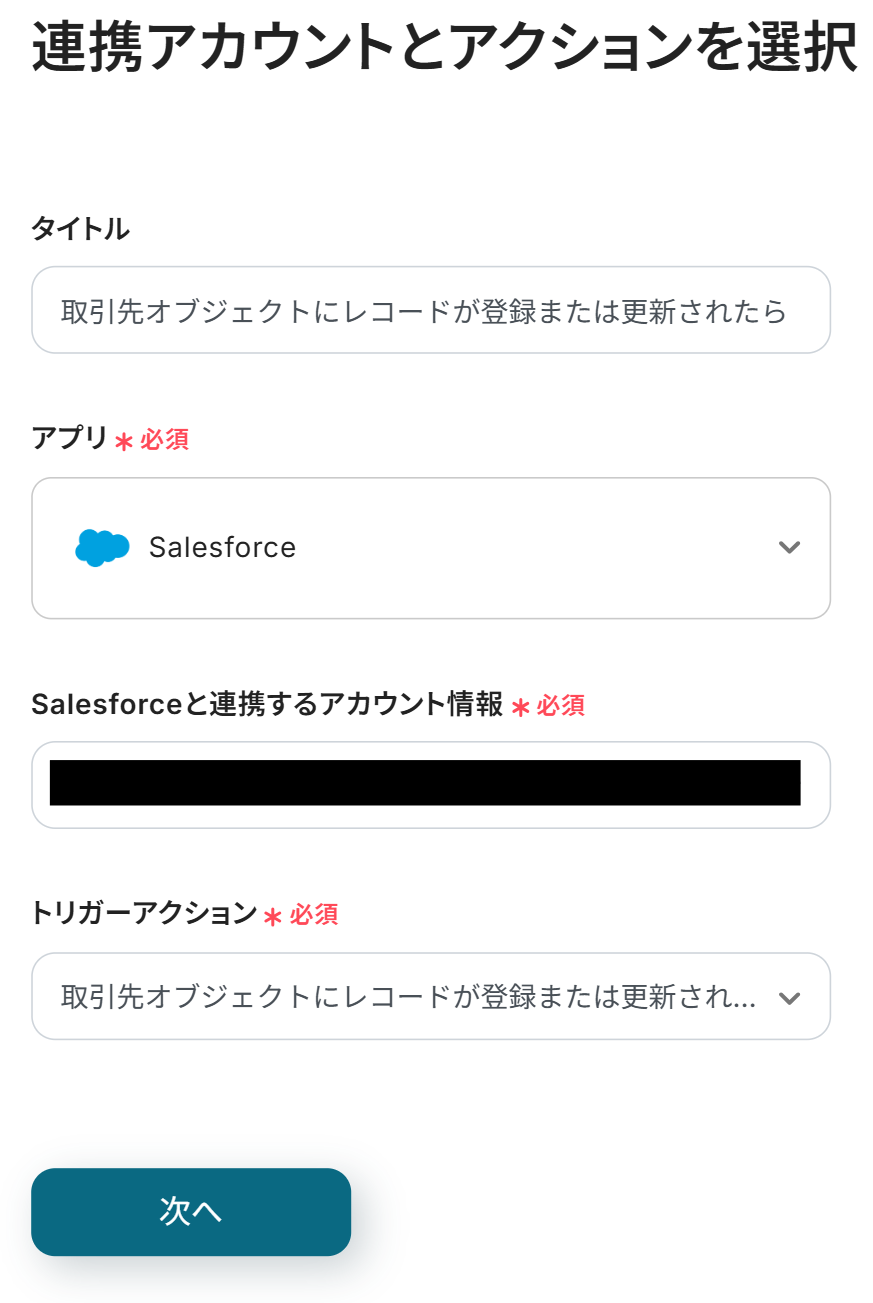 最初に、Salesforceで取引先オブジェクトのレコードが更新された際の設定を行うため、「取引先オブジェクトにレコードが登録または更新されたら」をクリックします。