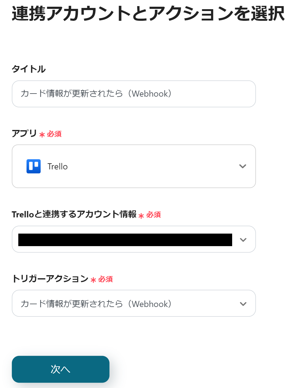 最初に、Trelloのカード情報が更新されたらフローボットを起動する設定を行うため、「カード情報が更新されたら(Webhook)」をクリックします。