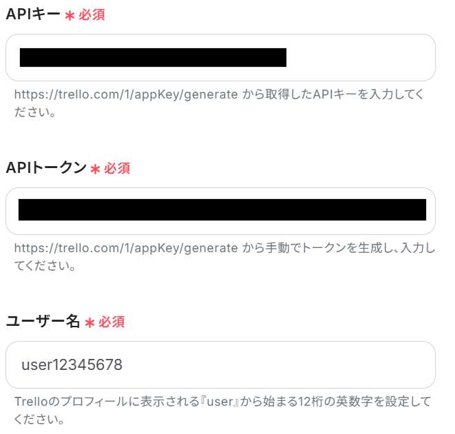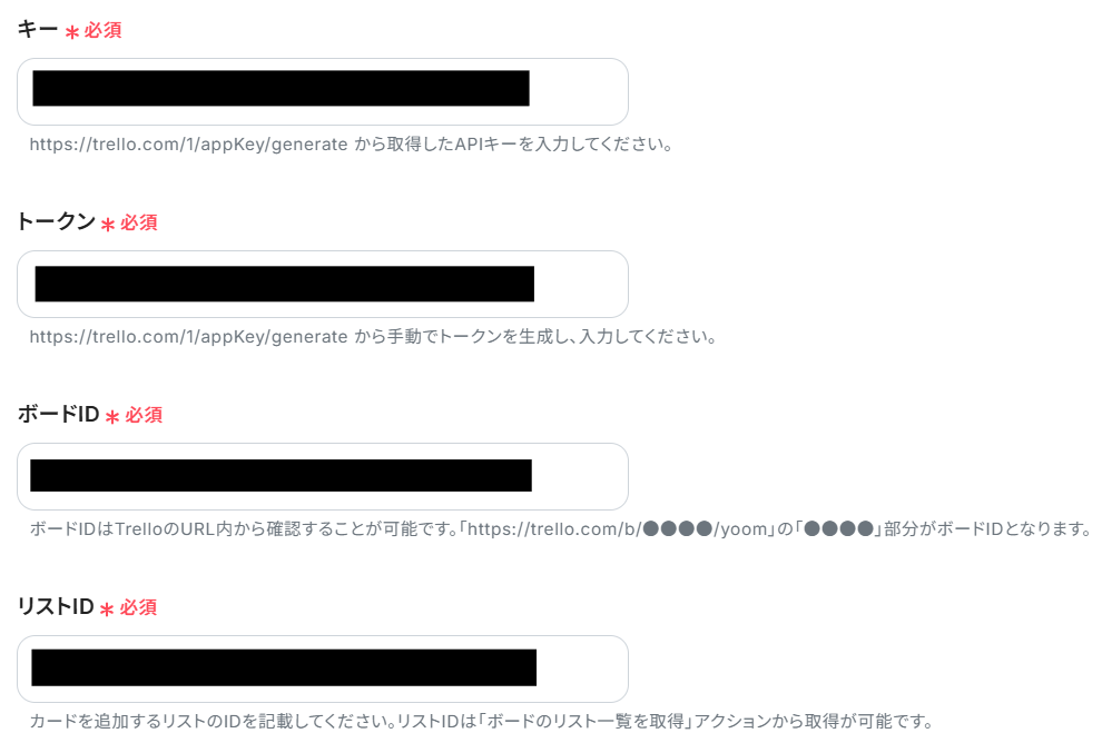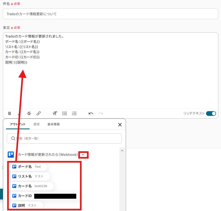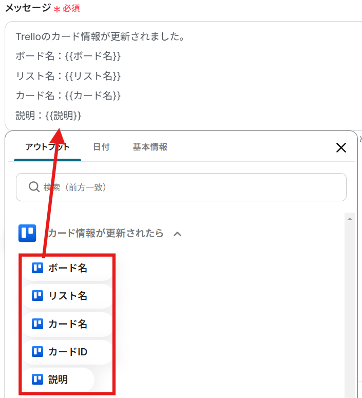 Trelloのアウトプットを活用し、Slackに通知したいカード情報を以下のように設定してください。