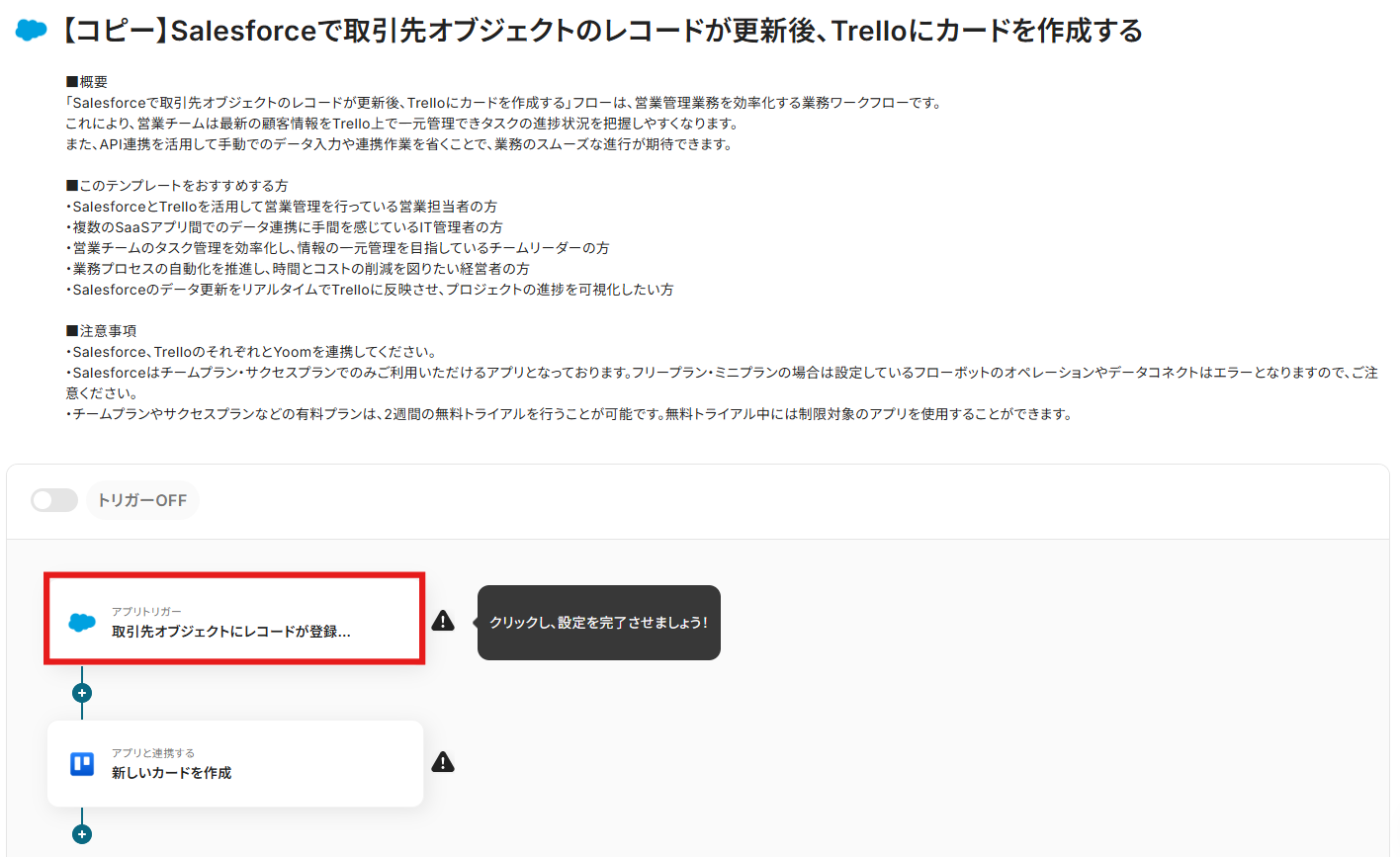 また、Salesforceの取引先オブジェクトのレコードが更新された際にTrelloに新しいカードを作成する自動化により、手作業での入力が不要になります。
