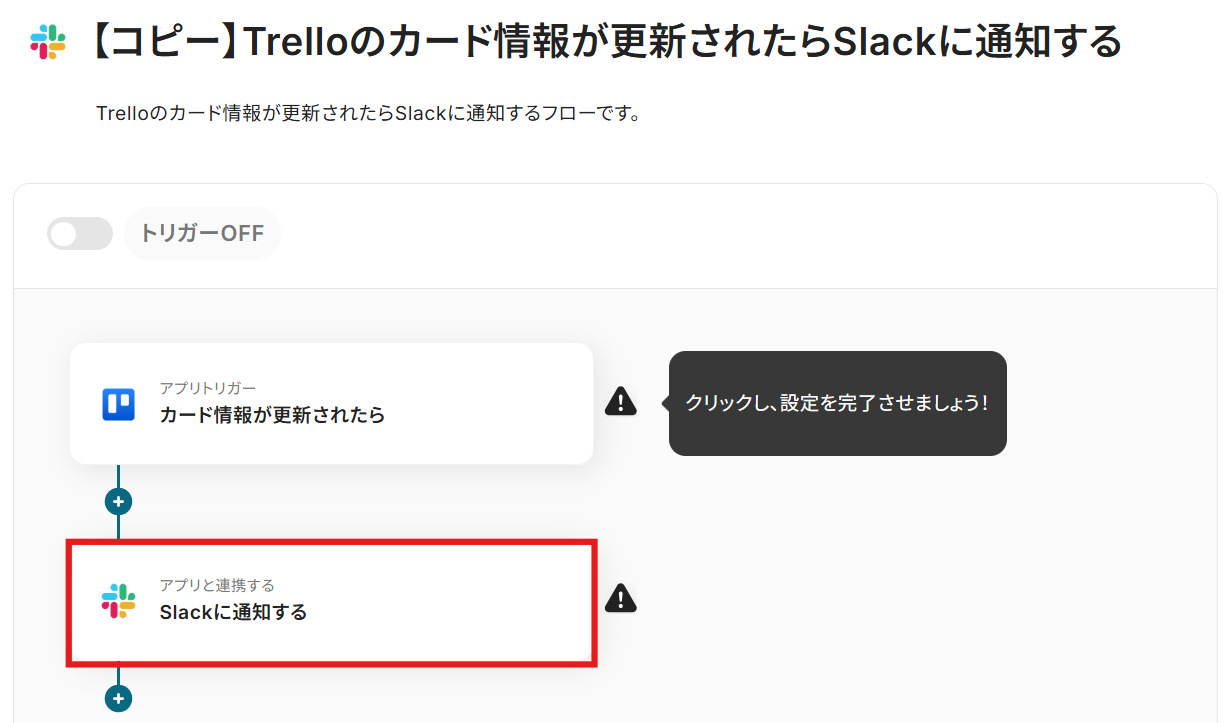 先ほど設定したテンプレートから派生して、こちらはSlackにTrelloのカード情報更新を通知するフローとなっています。