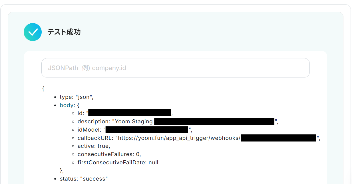 テストが成功すると「テスト成功」と表示され、「アウトプット」に先ほどテスト用に更新したカード情報が追加されます。