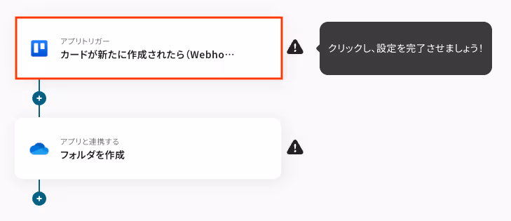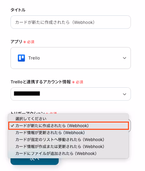 一つ目のオペレーションにある、「カードが新たに作成されたら(Webhook)」をクリックしてください。