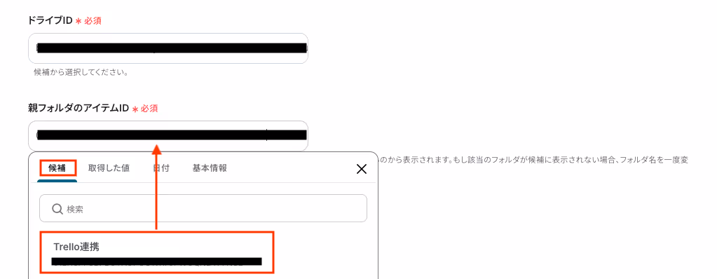 「ドライブID」「親フォルダのアイテムID」を候補から選択します。