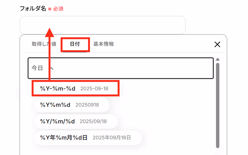 例えば、日付を選択することで、日付を差し込んだフォルダの作成が可能です。もちろん、日付と取得した値の両方を活用したフォルダ名の作成も可能です。
