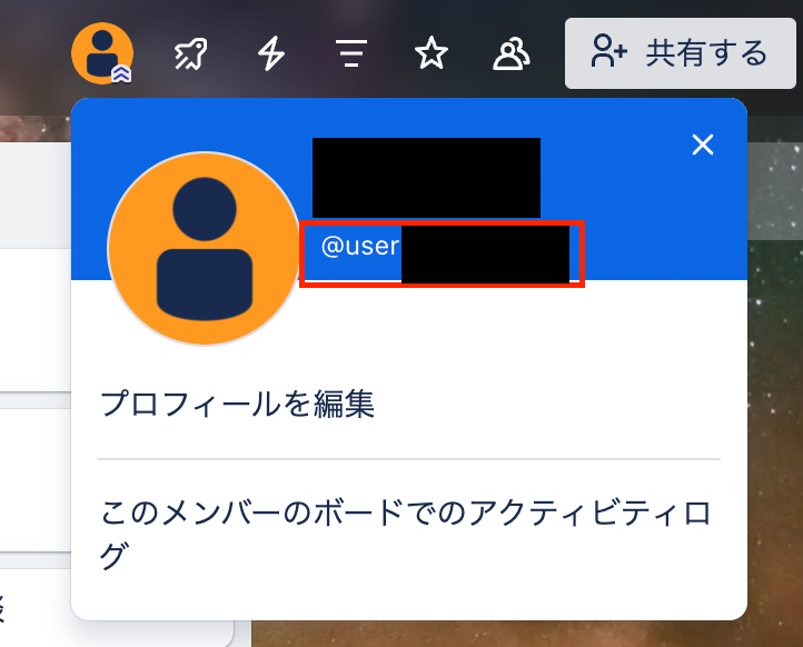 なお、ユーザーIDはTrelloのアイコンマークをクリックすると表示されます。