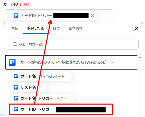 カードIDは「取得した値」から、先ほどリストの移動を行ったカードIDを選択しましょう。