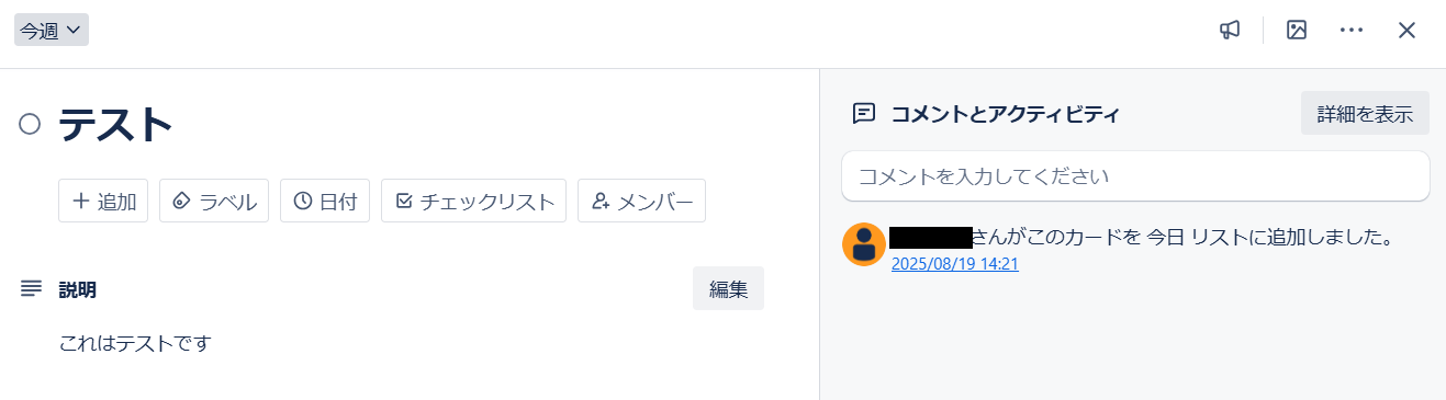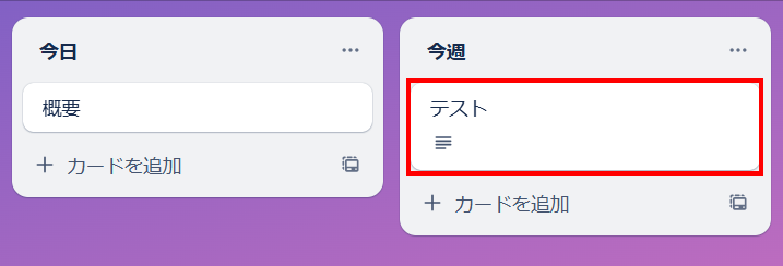 今回は、下記赤枠のようなカードを「今日」リストに作成し、「今週」リストへ移動しました。