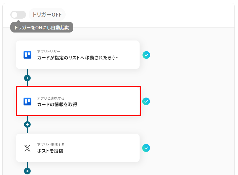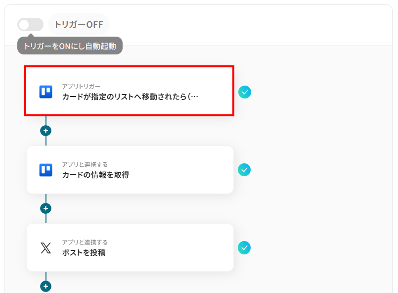 このワークフローを活用すれば、Trelloでカードを特定のリストへ移動させるだけで、X(Twitter)への投稿を自動化できるため、こうした情報発信のプロセスを効率化できます。